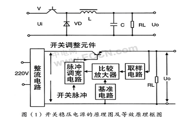 圖(1)畫出了開關(guān)穩(wěn)壓電源的原理圖及等效原理框圖,它是由全波整流器,開關(guān)管Vi,激勵信號,續(xù)流二極管VD,儲能電感和濾波電容C組成。實際上,開關(guān)穩(wěn)壓電源的核心部分是一個直流變壓器。這里我們對直流變換器和逆變器作如下解釋。逆變器,它是把直流轉(zhuǎn)變?yōu)榻涣鞯难b置。逆變器通常被廣泛地應(yīng)用在采用電平或電池組成的備用電源中。直流變換器,它是把直流轉(zhuǎn)換成交流,然后又把交流轉(zhuǎn)換成直流的裝置。這種裝置被廣泛地應(yīng)用在開關(guān)穩(wěn)壓電源中。采用直流變換器可以把一種直流供電電壓變換成極性、數(shù)值各不同的多種直流供電電壓。