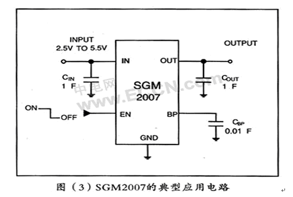 目前大多IC設(shè)計產(chǎn)商生產(chǎn)的低壓差線性穩(wěn)壓器(LDO)典型封裝都是SOT23-5和SOT23-3,如圣邦微電子的SGM2007,SGM2013。如圖(3)為SGM2007的典型應(yīng)用電路圖。
