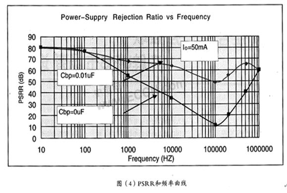 電源抑制比PSRR(Power supply ripple rejectionratio)是反應(yīng)LDO輸出對輸入紋波抑制能力的一個交流參數(shù),一般輸出和輸入的頻率是一樣的,PSRR的值越大說明LDO的紋波能力越強,也就是說輸入對輸出的影響很小。盡管LDO的電源抑制比很強,但都是在一定頻率內(nèi)的抑制很強,一般的在50KHz到200kHz的電源抑制比還是很差的如圖(4)為SGM2007的PSRR和頻率曲線,而這段頻率正是大多數(shù)開關(guān)電源的工作頻率,如果LDO的負(fù)載和輸入輸出電容匹配不好,很容易引起LDO振蕩。而造成整個LDO供電系統(tǒng)的不穩(wěn)定。