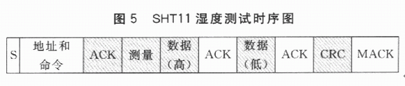 SHTll濕度測試時(shí)序如圖5所示。其中,陰影部分為SHTll控制總線。主機(jī)發(fā)出啟動(dòng)命令,隨后發(fā)出一個(gè)后續(xù)8位命令碼。該命令碼包含3個(gè)地址位(芯片設(shè)定地址為000)和5個(gè)命令位;發(fā)送完該命令碼,將DATA總線設(shè)為輸入狀態(tài)等待SHTll的響應(yīng);SHTll接收到上述地址和命令碼后,在第8個(gè)時(shí)鐘下降沿,將DATA下拉為低電平作為從機(jī)的ACK;在第9個(gè)時(shí)鐘下降沿之后,從機(jī)釋放DATA(恢復(fù)高電平)總線;釋放總線后,從機(jī)開始測量當(dāng)前濕度,測量結(jié)束后,再次將DATA總線拉為低電平;主機(jī)檢測到DATA總線被拉低后,得知濕度測量已經(jīng)結(jié)束,給出SCK時(shí)鐘信號(hào);從機(jī)在第8個(gè)時(shí)鐘下降沿,先輸出高字節(jié)數(shù)據(jù);在第9個(gè)時(shí)鐘下降沿,主機(jī)將DATA總線拉低作為ACK信號(hào),然后釋放總線DATA;在隨后8個(gè)SCK周期下降沿,從機(jī)發(fā)出低字節(jié)數(shù)據(jù);接下來的SCK下降沿,主機(jī)再次將DATA總線拉低作為接收數(shù)據(jù)的ACK信號(hào);最后8個(gè)SCK下降沿從機(jī)發(fā)出CRC校驗(yàn)數(shù)據(jù),主機(jī)不予應(yīng)答(NACK)則表示測量結(jié)束。