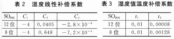 式中:RHincar為經(jīng)過線性補(bǔ)償后的濕度值,SORH為相對(duì)濕度測量值,C1、C2、C3為線性補(bǔ)償系數(shù),取值如表2所列。