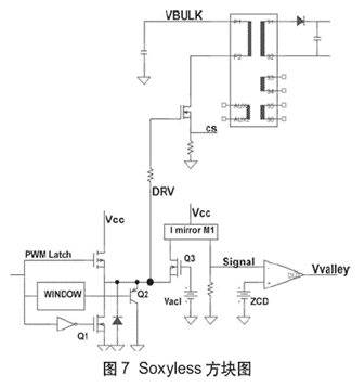 施加到電容上的電壓源提供對電壓有負(fù)90°相移的電流。所以當(dāng)電流上升到零點時,電壓便對應(yīng)于其峰值。所述的Soxyless技術(shù)包含檢測正柵極電流的過零檢測器(ZCD)以確定“谷點”的出現(xiàn)。