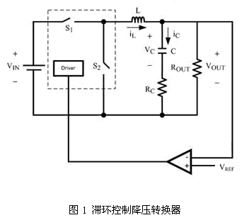 滯環(huán)控制功率轉(zhuǎn)換器的運(yùn)行可如下簡(jiǎn)述。以圖1中的降壓轉(zhuǎn)換器為例,當(dāng)輸出電壓VOUT下降低于閾值VREF時(shí),那么開(kāi)關(guān)S1便會(huì)開(kāi)啟(S2作為互補(bǔ)工作性質(zhì))。相反,當(dāng)VOUT高于VREF時(shí),那S1便會(huì)關(guān)閉。這種運(yùn)作方式與可變結(jié)構(gòu)控制系統(tǒng)類似,它能夠依據(jù)一個(gè)超平面(hyper-plane)來(lái)轉(zhuǎn)換控制法則。因此,可變結(jié)構(gòu)控制理論便成為分析滯環(huán)控制功率轉(zhuǎn)換器的最佳工具。