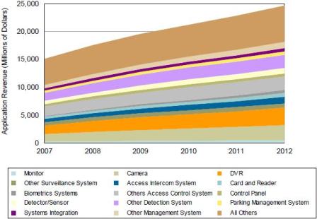 2007-2012年,住宅應(yīng)用的市場(chǎng)份額預(yù)計(jì)將從18.8%升至22.1%。同期政府在安防方面的支出將會(huì)下降。但是,用于監(jiān)控交通與零售店的視頻監(jiān)視增長較快,將推動(dòng)中國安防市場(chǎng)的增長。安防系統(tǒng)在制造業(yè)的滲透率較高,預(yù)計(jì)未來在該領(lǐng)域的增長將會(huì)放緩。
