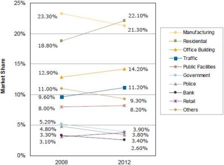 市場(chǎng)對(duì)安防產(chǎn)品的需求多種多樣,涉及眾多領(lǐng)域,包括制造、政府、金融、運(yùn)輸、教育、醫(yī)療保健、住宅及商業(yè)樓宇。在國際市場(chǎng),安防產(chǎn)品的主要用戶是政府、工業(yè)及個(gè)別家庭。在中國,制造業(yè)、住宅與商業(yè)樓宇是營業(yè)收入排在前三位的三大市場(chǎng)領(lǐng)域,合計(jì)所占份額超過55%。