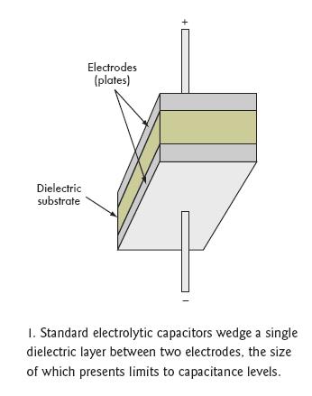 [page]標(biāo)準(zhǔn)電容的結(jié)構(gòu)是在兩個(gè)附屬于金屬板上的電極之間夾一層電介質(zhì)層(圖1)。根據(jù)電容類型不同,電介質(zhì)可以是氧化鋁、四氧化鉭、氧化鈦鋇或聚丙烯聚酯,不同的材料決定了不同的容量和電壓特性(圖2)。電介質(zhì)的多少和極板間的距離也會影響電容量。然而,極板間最大允許距離限制了電介質(zhì)的數(shù)量。