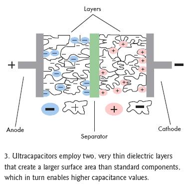 雙電層電容器(EDLC)正如它的字面意義那樣可以解決上述問題,它在相同的封裝內(nèi)增加了第二個(gè)電介層,這個(gè)電介層與第一層在中間隔離物的兩邊并行工作(圖3)。EDLC也采用無孔電介質(zhì),如活性碳、碳納米管、炭黑凝膠,并選用導(dǎo)電聚合物,其存儲容量要比標(biāo)準(zhǔn)的電解材料高出許多。額外層和更高效電介材料的這種組合能使電容容量提高近4個(gè)數(shù)量級。