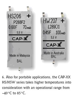 同樣針對緊湊空間設(shè)計(jì)但可耐更高溫度的CAP-XX公司HS和HW系列電容器具有很薄的外殼,工作溫度范圍是-40℃到85℃(圖6)。在4.5到5.5V電壓范圍內(nèi),HW的尺寸為28.5x17mm。在5.5V電壓時(shí)的電容量可達(dá)0.4F,ESR在5.5V時(shí)可低至100mΩ。