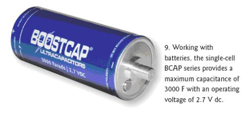MaxwellTechnologies公司還有許多大型的具有很高容量的BOOSTCAP品牌單節(jié)電容器,不過工作電壓比較低。BCAP系列共5節(jié),在2.7Vdc的工作電壓下電容值可達(dá)650、1200、11500、2000和3000F(圖9)。這些電容的主要用途是與電池并行工作,適合要求恒定低功率放電以及峰值負(fù)載下提供脈沖功率的應(yīng)用。