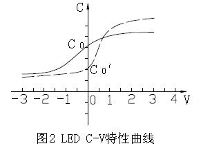 鑒于LED 的芯片有9×9mil (250×250um),10×10mil,11×11mil (280×280um),12×12mil (300×300um),故pn 結(jié)面積大小不一,使其結(jié)電容(零偏壓)C≈n+pf左右。C-V 特性呈二次函數(shù)關(guān)系(如圖2)。由1MHZ 交流信號用C-V 特性測試儀測得。