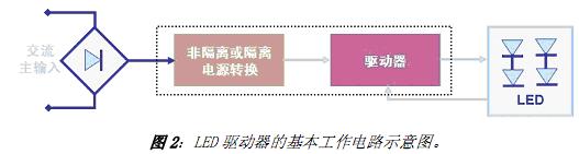 LED 的排列方式及LED 光源的規(guī)范決定著基本的驅(qū)動(dòng)器要求。LED 驅(qū)動(dòng)器的主要功能就是在一定的工作條件范圍下限制流過(guò)LED 的電流, 而無(wú)論輸入及輸出電壓如何變化。LED驅(qū)動(dòng)器基本的工作電路示意圖如圖2 所示,其中所謂的“隔離”表示交流線路電壓與LED(即輸入與輸出)之間沒(méi)有物理上的電氣連接,最常用的是采用變壓器來(lái)電氣隔離,而“非隔離”則沒(méi)有采用高頻變壓器來(lái)電氣隔離。