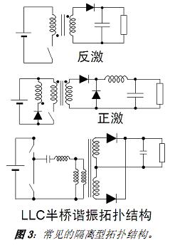 電路中通常加入了變壓器的隔離型AC-DC 電源轉(zhuǎn)換包含反激、正激及半橋等拓?fù)浣Y(jié)構(gòu),參見(jiàn)圖3,其中反激拓?fù)浣Y(jié)構(gòu)是功率小于30 W 的中低功率應(yīng)用的標(biāo)準(zhǔn)選擇,而半橋結(jié)構(gòu)則最適合于提供更高能效/功率密度。就隔離結(jié)構(gòu)中的變壓器而言,其尺寸的大小與開(kāi)關(guān)頻率有關(guān),且多數(shù)隔離型 LED 驅(qū)動(dòng)器基本上采用“電子”變壓器。