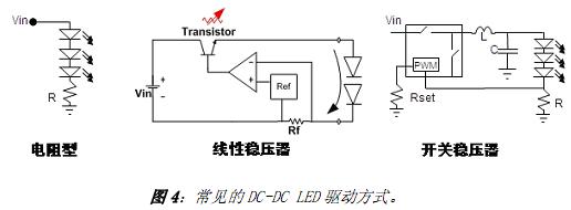 采用 DC-DC 電源的LED 照明應(yīng)用中,可以采用的LED 驅(qū)動(dòng)方式有電阻型、線性穩(wěn)壓器及開(kāi)關(guān)穩(wěn)壓器等,基本的應(yīng)用示意圖參見(jiàn)圖 4。電阻型驅(qū)動(dòng)方式中,調(diào)整與LED 串聯(lián)的電流檢測(cè)電阻即可控制LED 的正向電流,這種驅(qū)動(dòng)方式易于設(shè)計(jì)、成本低,且沒(méi)有電磁兼容(EMC)問(wèn)題,劣勢(shì)是依賴于電壓、需要篩選(binning) LED,且能效較低。