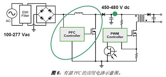 有源 PFC(見(jiàn)圖6)通常是作為一個(gè)專門(mén)的電源轉(zhuǎn)換段增加到電路中來(lái)改變輸入電流波形。有源PFC 通常提供升壓,交流100 至277 Vac的寬輸入范圍下,PFC 輸出電壓范圍達(dá)直流450 至480 Vdc。如果恰當(dāng)?shù)卦O(shè)計(jì)PFC 段,可以提供91%到95%的高能效。但增加了有源PFC,仍然需要專門(mén)的DC-DC 轉(zhuǎn)換來(lái)提供電流穩(wěn)流。