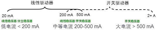 市場上典型的LED驅動器包括兩類,即線性驅動器和開關驅動器;大概的適用范圍見圖1。如電流大于500mA的大電流應用采用開關穩(wěn)壓器,因為線性驅動器限于自身結構原因,無法提供這樣大的電流;而在電流低于200mA的低電流應用中,通常采用線性穩(wěn)壓器或分離穩(wěn)壓器;而在200至500mA的中等電流應用中,既可以采用線性穩(wěn)壓器,也可以采用開關穩(wěn)壓器。