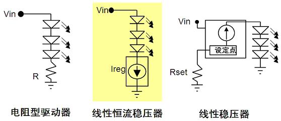 開關穩(wěn)壓器的能效高,且提供極佳的亮度控制。線性穩(wěn)壓器結構比較簡單,易于設計,提供穩(wěn)流及過流保護,且沒有電磁兼容性(EMC)問題。