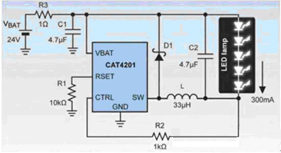 智能樓宇中的備用電源一般為直流24V,市電斷電之后仍需要備用照明長時間的工作,省電是備用照明的重點,此時正是電感型轉換器LED驅動器的用武之地。圖3說明了如何利用CAT4201從一個24V電源來驅動5只1W的LED。