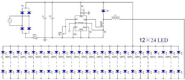 本方案整體供電效率可達80%以上,典型為85-88%;可調節(jié)毫安級到安培級的輸出應用;低頻可變占空比的數字脈沖調光功能和線性調光功能;多達上百個LED的串/并聯(lián)使用;內部集成頻抖功能改善EMI;外部設定LED過溫保護功能。最大的特點是成本控制好,使用較少的元件,達到了高效低成本的驅動要求以滿足民用照明的需要。