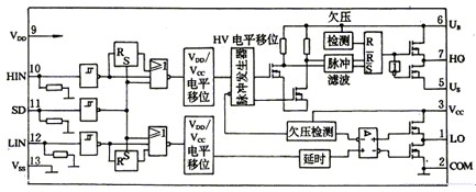 在大功率應(yīng)用場合,由于上述驅(qū)動(dòng)電路受驅(qū)動(dòng)能力的限制,無法可靠地驅(qū)動(dòng)大型MOSFET、IGBT。而集成驅(qū)動(dòng)器的出現(xiàn)則很好地解決了這一問題。國內(nèi)外已推出了多種具有保護(hù)功能的智能驅(qū)動(dòng)器,如日本產(chǎn)的EXB841、EXB850,國產(chǎn)的M57959和CWK等。它們具有許多優(yōu)點(diǎn),如電路參數(shù)一致性好、運(yùn)行穩(wěn)定可靠、具有多種保護(hù)功能等。但它們最大的不足是需要單獨(dú)的浮地電源,給系統(tǒng)帶來了不便。最近IR公司推出了IR2110集成驅(qū)動(dòng)器,它針對上述驅(qū)動(dòng)器電源系統(tǒng)的不足,設(shè)置了自舉浮動(dòng)電源,只需一路電源即可實(shí)現(xiàn)隔離驅(qū)動(dòng)。對半橋、全橋式電路特別適用。IR2110的功能框圖如圖3所示。
