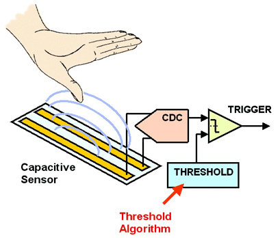 在許多情況下,接近傳感器在印制電路板包括兩個(gè)導(dǎo)體。中間媒介電介質(zhì)的值非常小(接近1)。如果一個(gè)物體,例如手,移動(dòng)到電容器的電子區(qū)域,它就改變電容。人體的組成超過90%水,因而電介質(zhì)的值非常大(約50)。