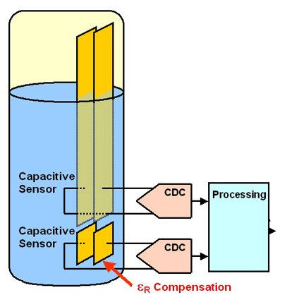 在一個(gè)液位傳感器中,一對固定的導(dǎo)板浸沒在要測量的液體中。制造商能夠以非常低的成本制造出印制導(dǎo)體。第二對導(dǎo)板附著在底部,可以檢測出由于溫度或其他影響導(dǎo)致的電介質(zhì)變化,如下圖所示。