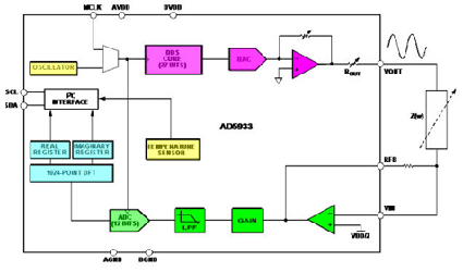 這里,傳感器的反應(yīng)通過快速的模數(shù)轉(zhuǎn)換器和快速的傅立葉分析記錄下來。采用DDS方法,初始的相位在任何時(shí)候都可精確地獲知。用同樣的方法,對其他頻率的反應(yīng)也可以測量出來。阻抗的實(shí)部和虛部可以據(jù)此計(jì)算出,并且通過數(shù)字總線輸出。完全掃描僅需要幾百毫秒。此圖對該方法進(jìn)行了說明。