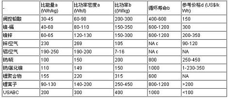 注:NA-數(shù)據(jù)不詳、a-C/3放電率、b-80%DOD、c-機械重充電、d-僅供參考、USABC-美國先進蓄電池協(xié)作體。