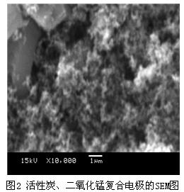 圖2是活性炭/二氧化錳復(fù)合電極的SEM圖。從圖中可以看出,電極具有疏松的表面孔結(jié)構(gòu),這種特有的結(jié)構(gòu)可以為在電極表面發(fā)生的雙電層反應(yīng)和法拉第贗電容反應(yīng)提供良好的環(huán)境。