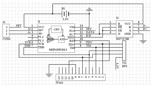 本文介紹的單片傳感信號接口設(shè)計采用了德州儀器公司新近推出的一款多功能的微控制器MSP430F2013,它內(nèi)部集成了16位的Σ-ΔADC。2kb的程序空間和128b的數(shù)據(jù)存儲空間,可以完成數(shù)據(jù)的智能采集,并采用差分傳輸方式進行數(shù)據(jù)的傳輸。數(shù)據(jù)按幀進行傳輸,傳輸過程中采用CRC檢驗進行差錯控制。