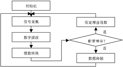 測量時使用內(nèi)部參考電壓,測量信號的電壓輸入范圍為0~500mV,當(dāng)輸入信號滿量程輸入,模數(shù)轉(zhuǎn)換輸出的最高位不為1時,可進行信號放大,最大放大倍數(shù)可達32。當(dāng)輸入信號的放大倍數(shù)為N時,輸入信號的范圍會相應(yīng)地縮小為原來的1/N。例如,當(dāng)選擇PGA的放大倍數(shù)為2倍時,測量信號的電壓輸入范圍為0~250mV。