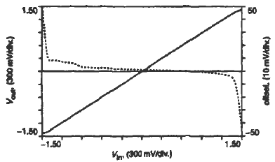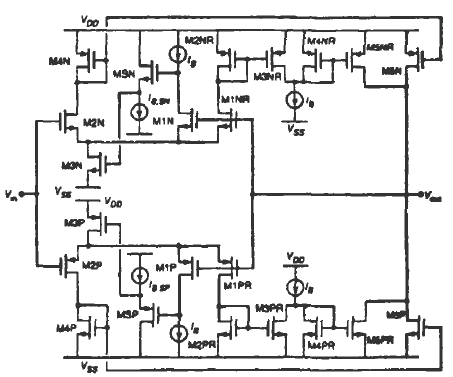 因此,這種緩沖器的工作過程可以這樣詳細描述如下:當(dāng)輸入信號Vin,在中部電源電壓區(qū),兩個輸入對MIP~M2P和MlN—M2N是有效的,M4P-M5P和M4N--M5N鏡像一個等于IB的電流到輸出支路。而且,電流IB的復(fù)制品通過晶體管MIPR(M1NR)和M2PR—M3PR(MlNR—M2NR)拷貝,給輸出支路底部的附加電路的電流源提供電流。因此,晶體管M4P和M5P(M4N和M5N)關(guān)斷,而且對輸出電流沒有任何貢獻。輸入信號接近VDD時,PMOS輸入對關(guān)斷,而且反相輸入支路的復(fù)制品等等都關(guān)斷。MIPR--M3PR不對輸出支路的附加電路發(fā)送任何電流。這樣的話,M4PR和M5PR導(dǎo)通,從輸出支路吸收等于IB的電流,維持緩沖器是導(dǎo)通的。當(dāng)輸入信號Vin接近VSS時,類似的情況也會發(fā)生。