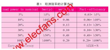 因此為了提高光伏逆變器的歐洲效率,僅僅降低額定負(fù)載時(shí)的損耗是不夠的,必須同時(shí)提高不同負(fù)載情況下的效率。歐洲效率是一個(gè)新的參數(shù),主要是針對(duì)光伏逆變器提出來(lái)的。由于太陽(yáng)光在不同時(shí)間,強(qiáng)度是不一樣的,所以光伏逆變器其實(shí)并不會(huì)一直工作在額定功率下,更多的是工作在輕負(fù)載的時(shí)候。所以衡量光伏逆變器的效率,不能完全以額定功率下的效率來(lái)衡量。所以歐洲人就想出來(lái)了一個(gè)新的參數(shù)–歐洲效率來(lái)衡量。歐洲效率的計(jì)算方法如表1。