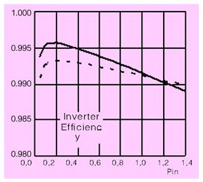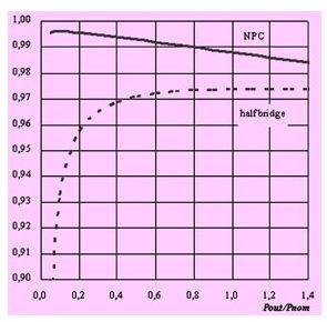 圖12 npc逆變橋輸出效率(實(shí)線)和半橋逆變效率(虛線)比較