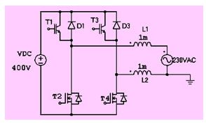 由于上橋臂的igbt工作在50hz的開關(guān)頻率下,實(shí)際上并不需要對(duì)該支路進(jìn)行濾波。因此對(duì)電路拓?fù)溥M(jìn)行優(yōu)化,可以得到圖14所示的發(fā)射極開路型拓?fù)洹_@種拓?fù)涞膬?yōu)點(diǎn)是只有有高頻電流經(jīng)過(guò)的支路才有濾波電感,從而減小了輸出濾波電路的損耗。