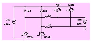 在圖13中,上橋臂igbt的開關(guān)頻率一般設(shè)定為電網(wǎng)頻率(例如50hz),而下橋臂的mosfet則工作在較高的開關(guān)頻率下,例如 16khz,來(lái)實(shí)現(xiàn)輸出正弦波。仿真顯示,這種逆變器拓?fù)湓?kw額定功率輸出時(shí),效率可以達(dá)到99.2%。由于mosfet內(nèi)置二極管的速度較慢,因此 mosfet不能被用在上橋臂。
