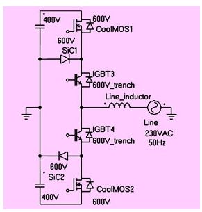 這種拓?fù)渲皇褂昧藘蓚€(gè)600v的sic二極管(d4,d6)。d3和d5采用快速si二極管,d7和d8采用小型si二極管,用來(lái)防止sic二極管過(guò)壓損壞。