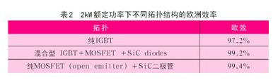 圖16所示拓?fù)浣Y(jié)構(gòu)允許純無(wú)功負(fù)載,能夠提高對(duì)電網(wǎng)的無(wú)功補(bǔ)償,也能滿足雙向功率流動(dòng),例如實(shí)現(xiàn)高效電池充電。如果應(yīng)用sic肖特基二極管,這種電路拓?fù)鋵⒖梢赃_(dá)到更高的效率等級(jí)。表2是2kw額定功率下不同拓?fù)浣Y(jié)構(gòu)的歐洲效率