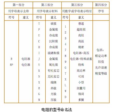 在電子電路中常用的電阻有固定式電阻和電位器,根據(jù)SJ-73標(biāo)準(zhǔn)規(guī)定,電阻器、電位器的命名由四部分組成:第一部分主稱,第二部分材料,第三部分分類特征,第四部分序號(不適用敏感電阻)。