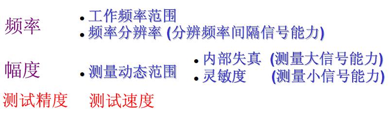 頻譜分析儀的基本性能指標(biāo)如下圖所示,包括頻率、幅度以及測(cè)試精度和測(cè)試速度。