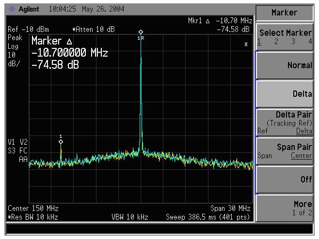 屏幕圖像下端的黃色跡線表示在輸入混頻器被過度激勵(lì)時(shí)的內(nèi)部失真。衰減為零。藍(lán)色跡線表示當(dāng)衰減設(shè)置為10dB時(shí),雜散信號(hào)所減少的電平。