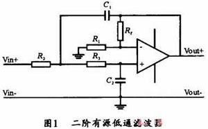 有源濾波器的設(shè)計(jì)原理圖如圖1所示,圖中采用了一個(gè)運(yùn)算放大器、四個(gè)電阻和兩個(gè)電容來構(gòu)成有適當(dāng)阻尼的二階有源低通濾波器。