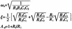 通過上式可以求出該有源濾波器的一些參數(shù),如自然角頻率ωn阻尼系數(shù)ξ和閉環(huán)增益Avf等: