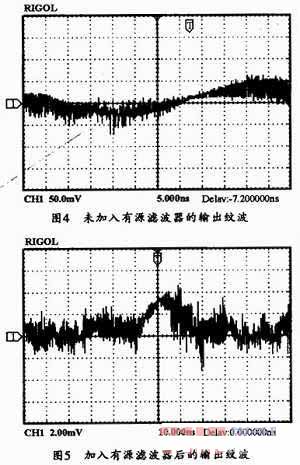 在有輸出紋波的波形中,圖4給出了未使用有源濾波網(wǎng)絡(luò)的輸出電壓紋波圖,而圖5所示則是使用有源濾波網(wǎng)絡(luò)后的輸出電壓紋波圖。