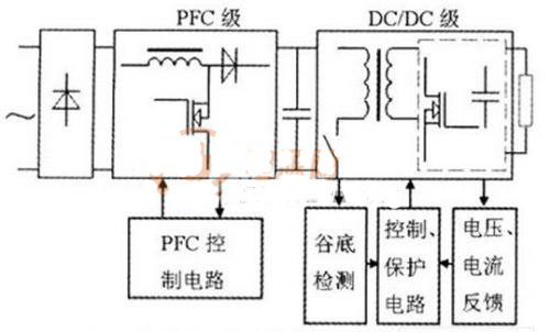 所研究的開關(guān)電源結(jié)構(gòu)如圖1所示,采用兩級PFC結(jié)構(gòu),由PFC預(yù)變換器、隔離變換器和同步整流電路組成的DC/Dc變換器以及檢測與保護電路組成。交流電壓經(jīng)整流后先輸入到PFC預(yù)變換器進行功率因數(shù)校正變換,再由電源控制電路控制隔離變換器,將直流電壓轉(zhuǎn)換成高頻交流脈沖電壓,此脈沖電壓經(jīng)同步整流器整流、濾波電路濾波后,得到所需的直流。