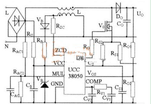 功率因數(shù)校正電路原理如圖4所示。電路中,電感L、功率MOS開關(guān)管Vo、二極管Do和電容Co組成Boost變換器。電阻分壓器RAc1和RAc2對輸入電壓波形取樣,獲得輸入電壓前饋信號,作為控制芯片UCC38050內(nèi)部乘法器的一個輸入,與電源反饋信號一起生成電感電流參考信號。電阻Rzc將電感電流過零信號輸入芯片,以控制開關(guān)管零電流開通。電阻Rs1檢測開關(guān)管電流,輸出電壓經(jīng)Ro1和Ro2分壓后反饋給芯片。這些信號輸入芯片后,經(jīng)過UCC38050內(nèi)部運算與控制,形成PWM控制信號,控制開關(guān)管通斷,使電流波形跟蹤電壓波形,實現(xiàn)功率因數(shù)校正。
