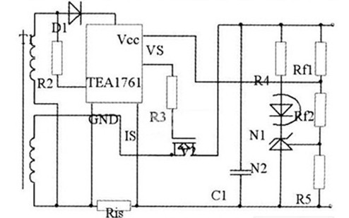 采用TEAl761T的同步整流電路如圖6所示。同步信號SRSENSE直接取自高頻變壓器次級,R3是輸出電流取樣電阻,通過選擇合適的R3的阻值,可控制最大輸出電流。TEA1761T具有欠電壓鎖定和啟動功能,D2為TEA1761T提供電源,同時檢測輸出電壓,當(dāng)Vcc引腳電壓高于8.6V,TEA1761T激活同步整流電路和輸出電壓與輸出電流檢測電路。當(dāng)電壓低于8.1v時,則進入欠電壓鎖定狀態(tài),驅(qū)動輸出保持低電平,光耦反饋輸出被封鎖。