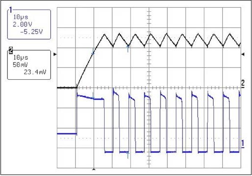 如圖7所示,Q1是降壓型充電器的開關功率晶體管;L1是濾波電感;D1是續(xù)流或整流二極管。輸入電容C1為10uF、超低ESR的陶瓷濾波電容。用鉭電容或者其它電解電容替代C1會使充電器的性能降低。R7是電流調節(jié)器檢測放大器的檢流電阻。DS2712的基準電壓為0.125V,并具有24mV滯回。通過CSOUT提供閉環(huán)、開關模式電流控制。充電控制引腳CC1將Q2的柵極拉低時,使能Q1的柵極驅動。Q1和Q2均為低Vt (柵-源門限電壓)的pMOSFET。CC1和CSOUT均為低電平時,Q2的漏-源電壓將稍大于Vt。該電壓以及CSOUT的正向壓降構成了Q1的柵極開關電壓。CC1為低電平時,啟動電流閉環(huán)控制。圖8所示為啟動開關時的波形。上方波形是0.125Ω (檢流電阻兩端的電壓,下方波形是Q1漏極至GND的電壓。開始時,當Q1打開(CC1和CSOUT均為低電平)時,電感電流向上爬升。當電流增大到使檢流電阻兩端的電壓達到0.125V時,CSOUT變?yōu)楦唠娖?,開關關斷。此后,電感電流開始下降,直到檢流電阻兩端的電壓達到約0.1V,CSOUT又變?yōu)榈碗娖?。只要CC1為低電平,該過程將一直持續(xù)。