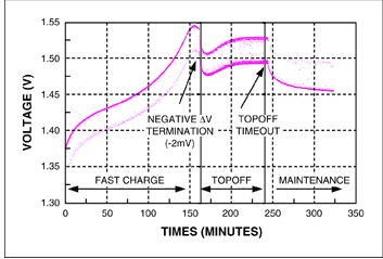 通常采用恒流源對NiMH電池充電。當達到充滿狀態(tài)時,會發(fā)生放熱化學反應,并導致電池溫度上升,電池端電壓降低??蓹z測電池溫度上升速率或者負向電壓變化率,并用來終止充電。這些充電終止方法分別稱為dT/dt和-ΔV。充電速率非常低時,dT/dt和-ΔV不太明顯,很難精確檢測到。電池開始進入過充狀態(tài)時,dT/dt和-ΔV響應開始顯現(xiàn)。此時如果繼續(xù)充電,將損壞電池。