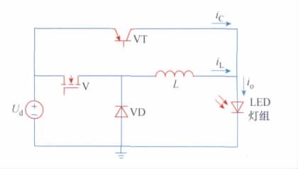 電路如圖1 所示。電路結(jié)構(gòu)以BUCK電路為主,取消電解電容濾波,用輔助線性電路對電感紋波電流進行補償。圖中由開關(guān)管V、電感L、LED 燈組、續(xù)流二極管VD 組成主電路; 晶體管VT 為輔助補償電路。