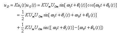 式中的ω0為壓控振蕩器在輸入控制電壓為零或?yàn)橹绷麟妷簳r的振蕩角頻率,稱為電路的固有振蕩角頻率。則模擬乘法器的輸出電壓uD為: